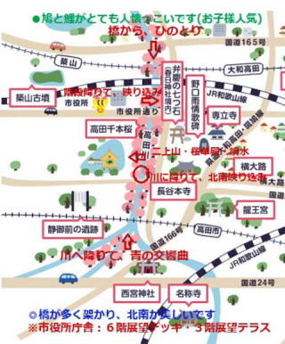 私が以前、Instagramに投稿しました、お勧め撮影スポットです。昨年、高田千本桜はご家族、カップルさん、ご夫婦、等の幅広い年齢層にご支持いただき、奈良県1番の人気スポットとなりました。Instagramの投稿数も凄い数で、お子様・フィギュア・ペットと一緒にと、お母さんカメラマンも多くおられました。また、上記以外のスポットも多くあり、撮り鉄さんの人気スポットには昨年、菜の花が植えられていて、ピンクに黄色の花が綺麗で可愛い写真となりました。鳩や鯉、小鳥も多く、とても楽しい写真となります。無料駐車場・休憩所・綺麗なトイレも完備され、大中公園では多くのテントを見ました。コンビニもたくさんあります。